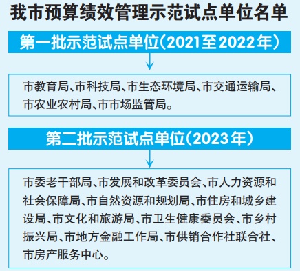 开展示范试点,旨在通过重点突破带动整体推进,实现全市绩效水平的整体改善和全面提升。2021至2022年,市财政局组织市市场监管局、市交通运输局等6家单位,开展第一批示范试点工作,取得良好效果。为加快推进预算绩效管理,2023年,市委老干部局、市发展和改革委员会、市人力资源和社会保障局等11家单位,开展第二批示范试点工作。
