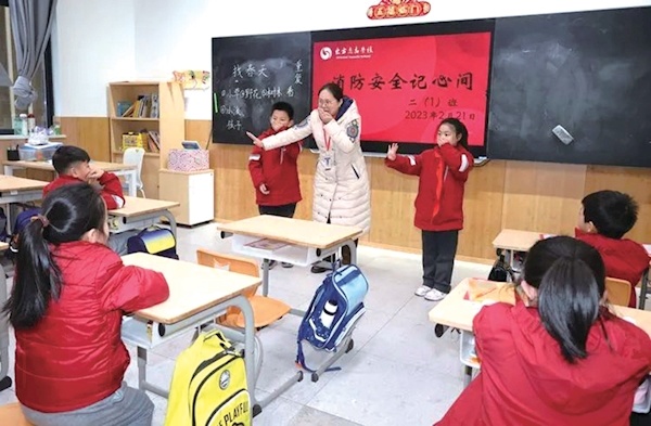 2月24日,十堰市东方远志学校组织全校师生开展消防应急疏散演练活动,演练结束后,各班开展“我是小小消防员”主题班会,通过故事、图片、视频等丰富多彩的形式让消防安全意识深入人心。图为老师为学生讲解消防逃生注意事项。图/通讯员杨润蕾