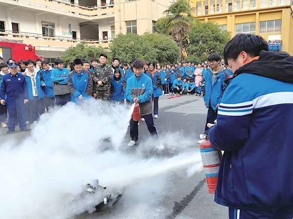2月23日,武当山特区消防救援大队在丹江口市二中开展“消防知识进校园”防火减灾应急演练活动,向学校师生宣传消防安全知识,教学火场逃生自救技能,演示各类消防器材的使用方法。图为学生学习使用灭火器灭火。图/通讯员秦永刚摄