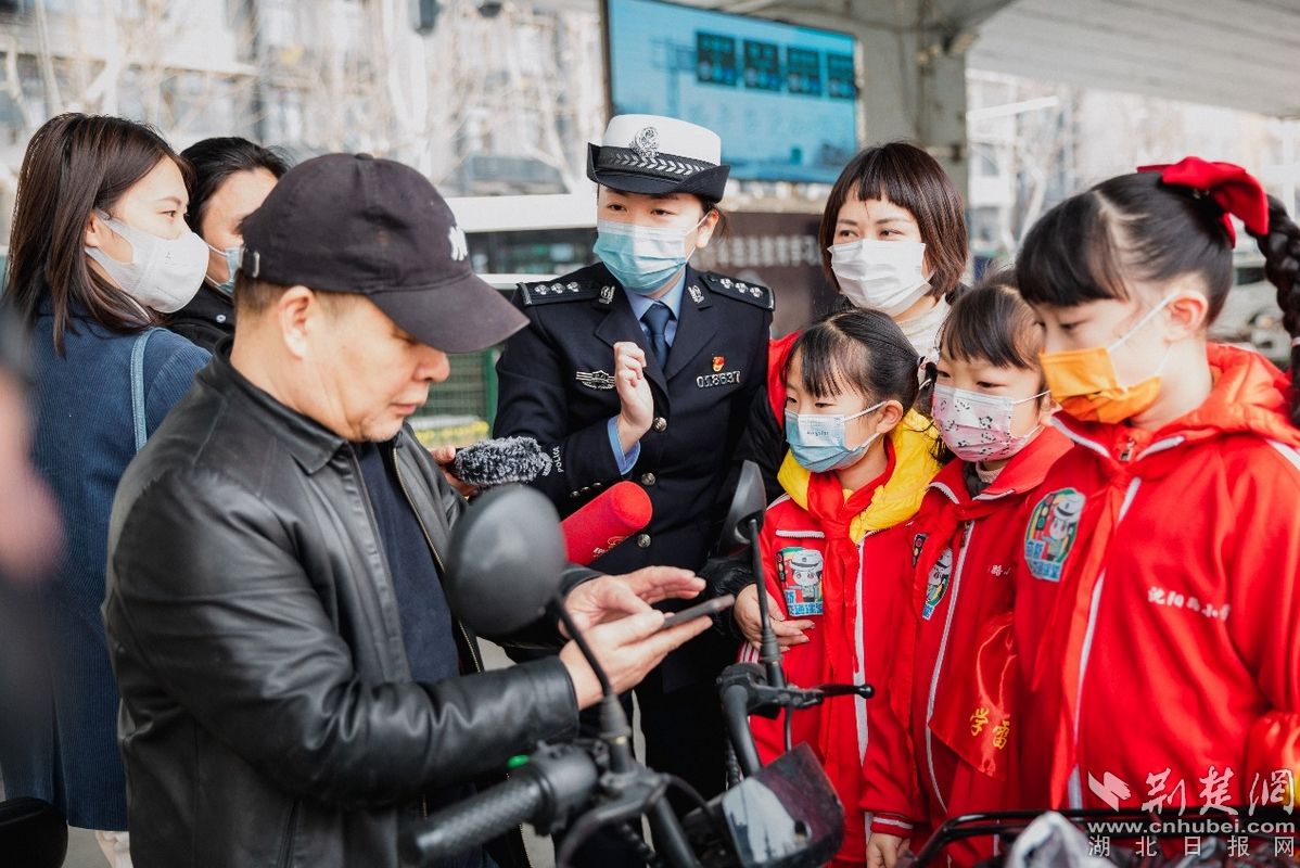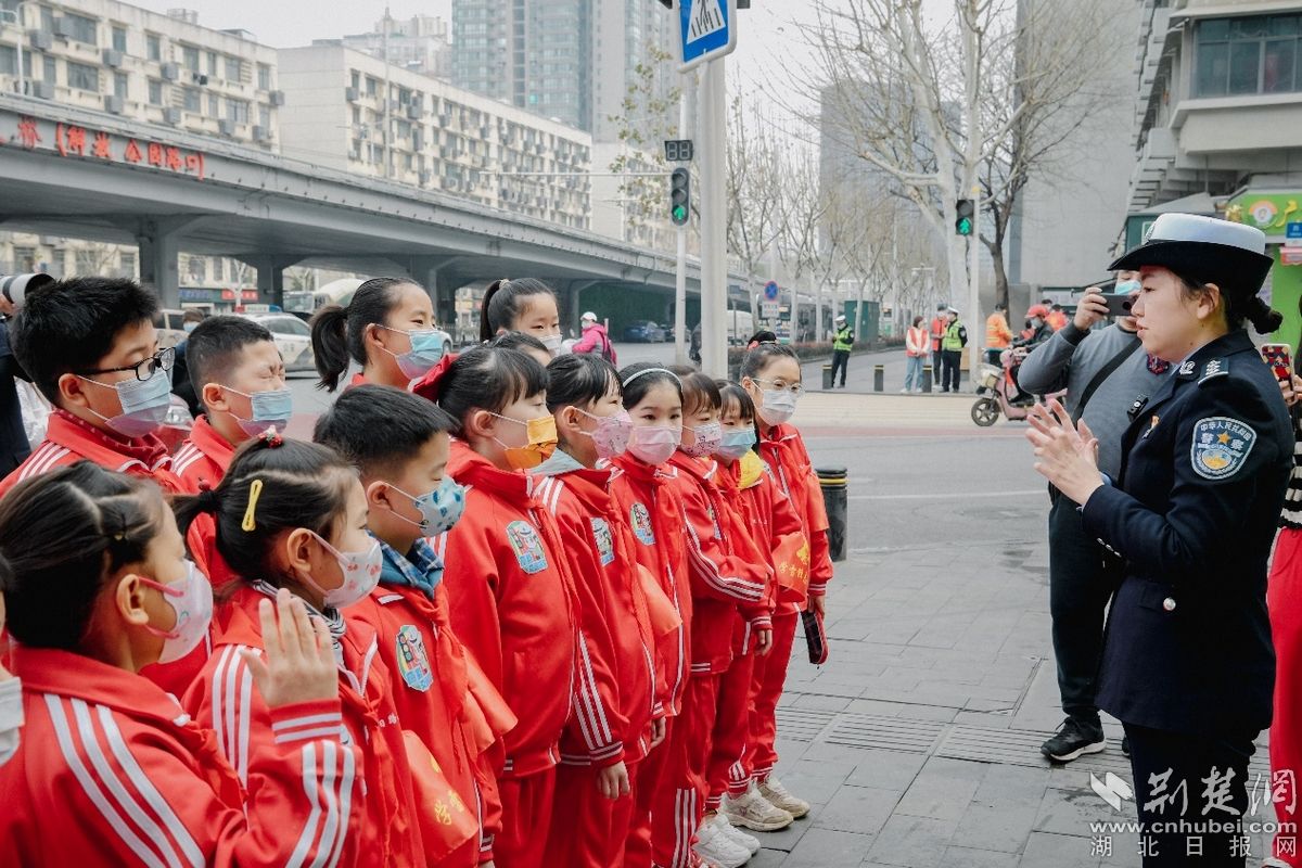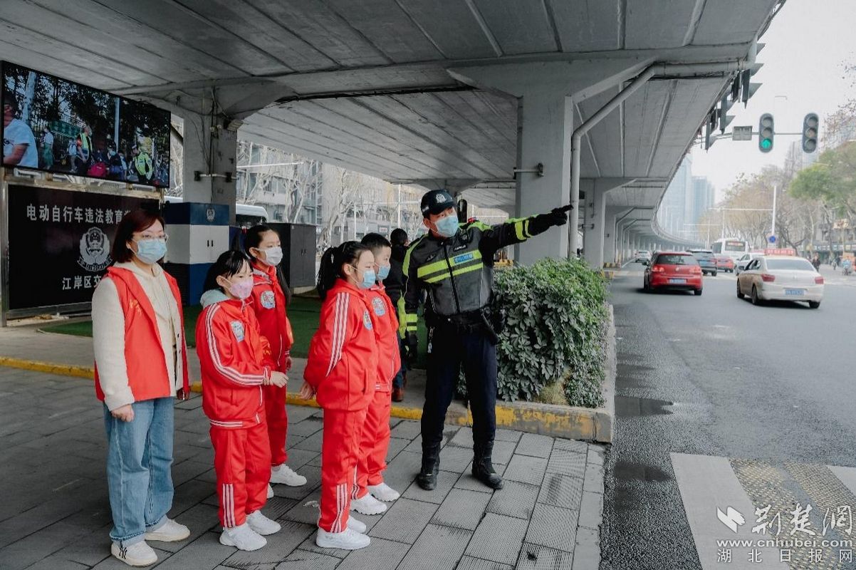 在解放大道解放公园路路口,武汉市公安局江岸区交通大队民警彭丽斯将她的“丽斯交通课堂”也搬到了马路上。现场,她拿出宣传海报,向在场师生详细介绍了中小学生出行注意事项,鼓励大家要争做文明交通志愿者。