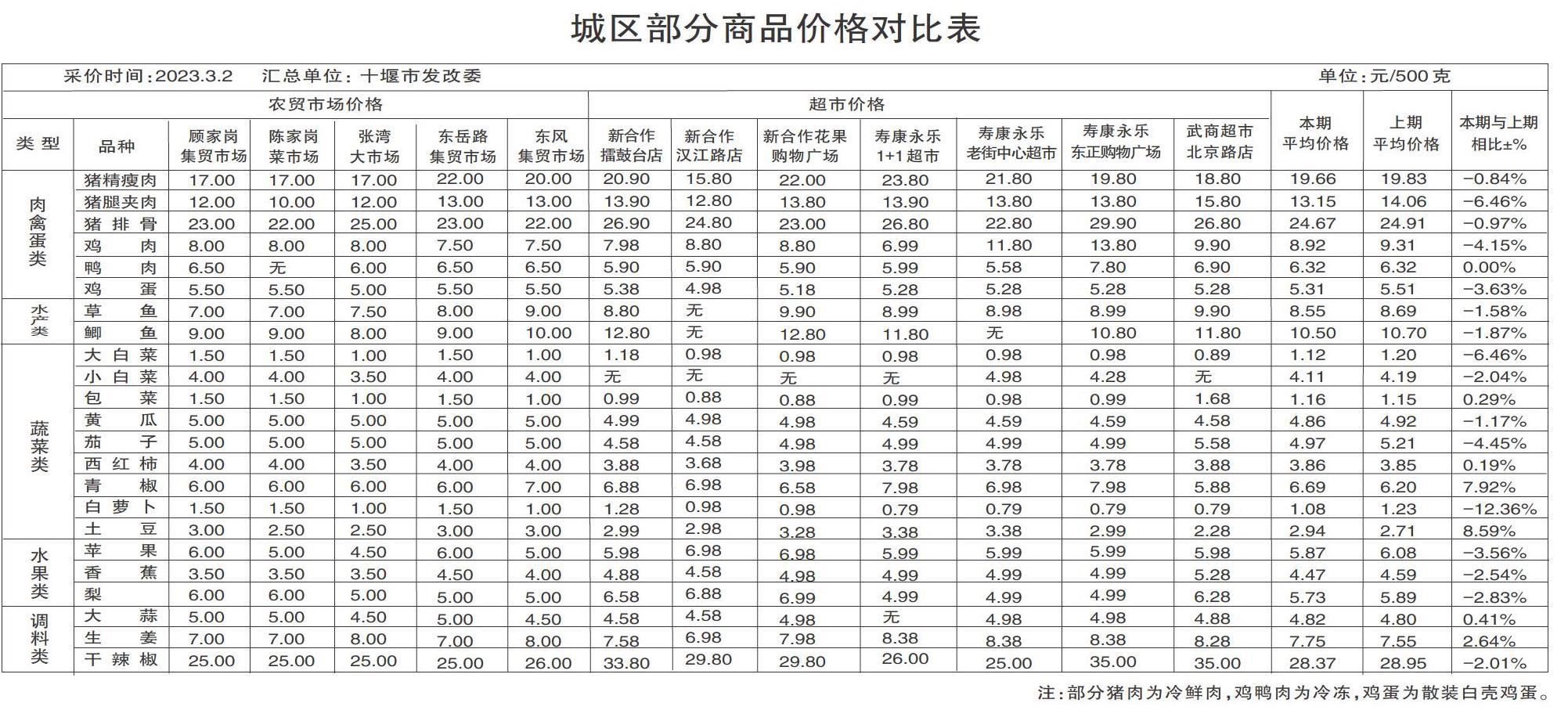 本报讯 3月2日采价显示,与上期相比,本期23种商品6涨16降1平。猪肉价格继续下行,蔬菜价格总体稳定。