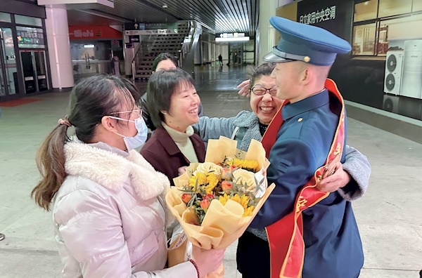 又是一年退伍季,连日来,服役期满的老兵们告别军营,纷纷踏上了归乡的列车。3月1日晚,随着G6809次列车到达十堰东站,数十名肩披红绶带,胸戴光荣花的战士走出车站,“回来了!回来了!”退役老兵的亲属们难掩激动地喊出声。图/记者张建波