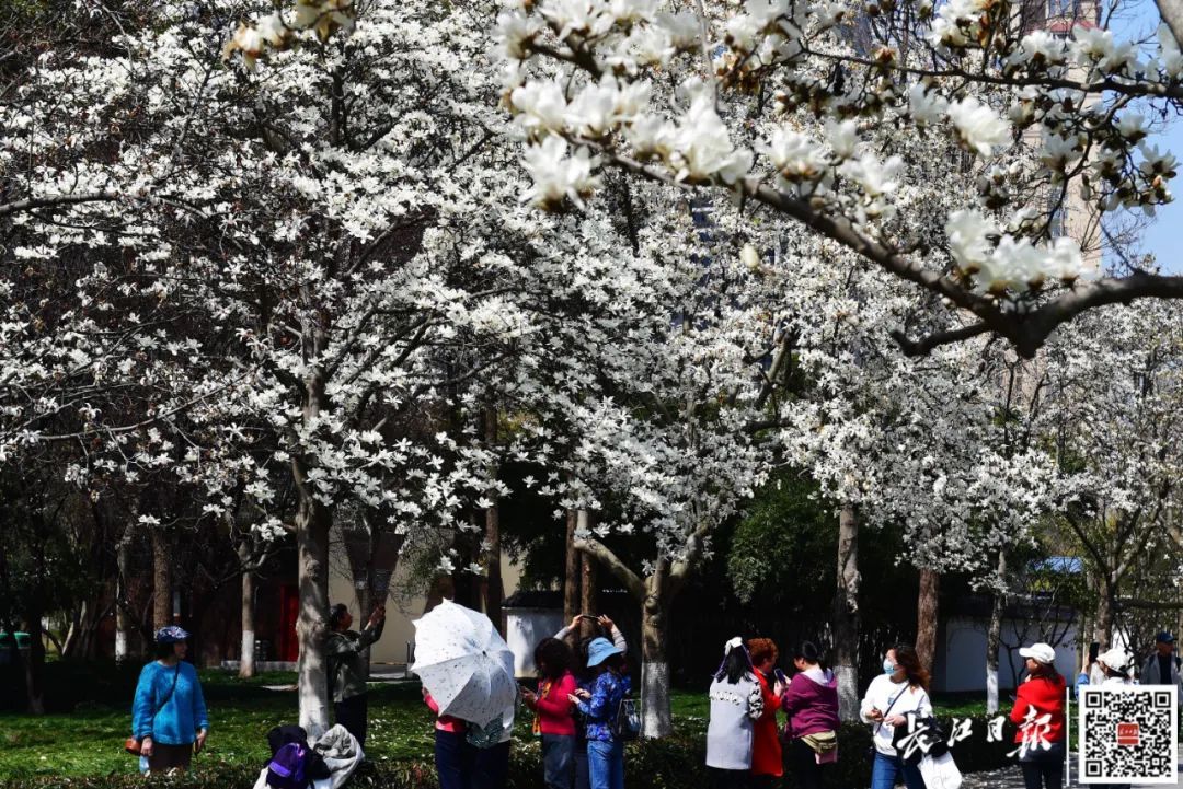 青山区和平公园,市民在白玉兰树下拍照。记者李永刚 摄