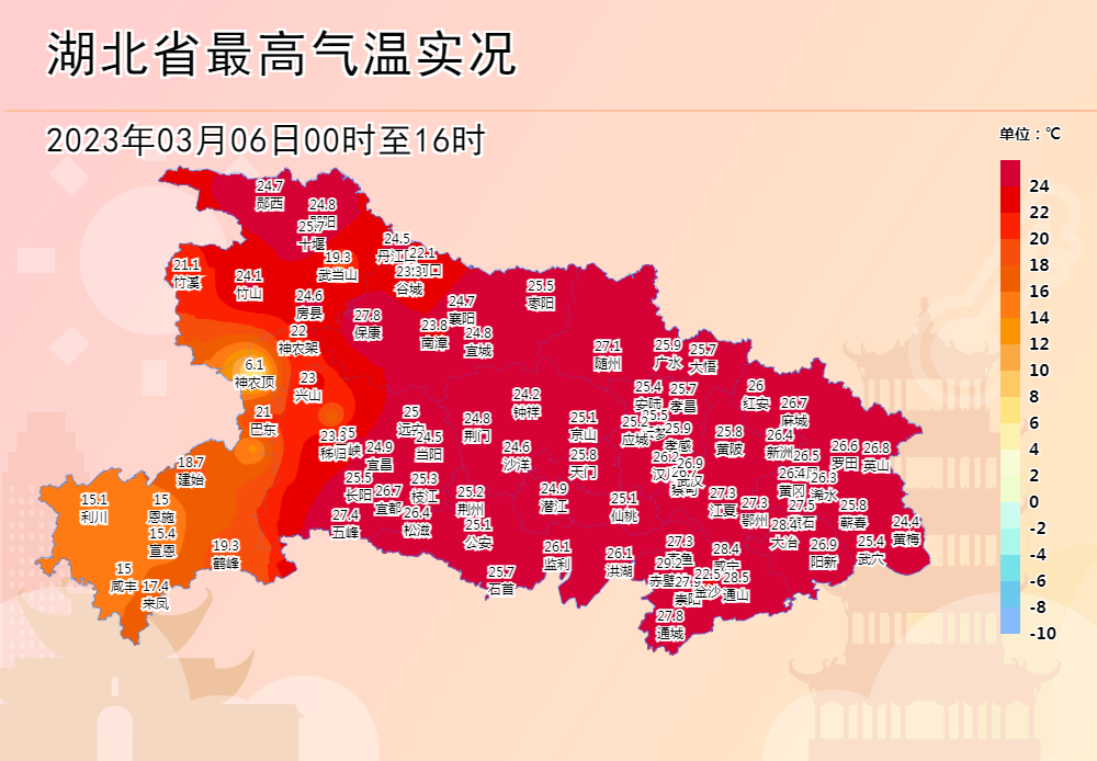 3月7日晚上到8日白天:阴天到多云,局部有零星小雨,最高气温23℃,最低气温14℃,偏南风2到3级,中心城区最高气温24℃,最低气温15℃。
