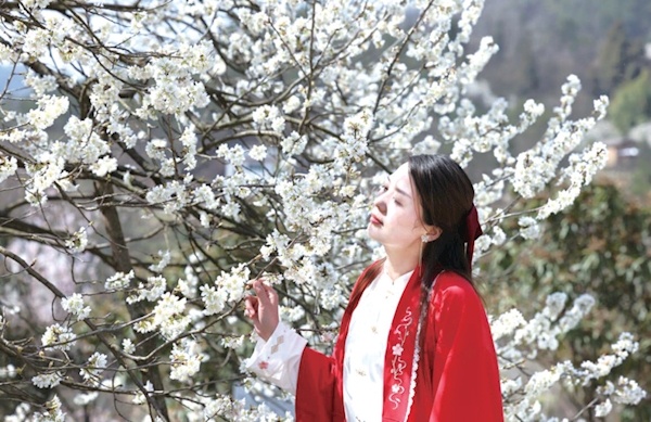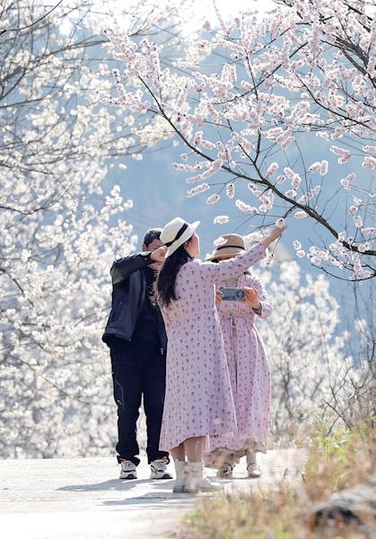“樱桃花,一枝两枝千万朵。花砖曾立摘花人,窣破罗裙红似火。”郧阳区茶店镇樱桃沟村,游客沉醉于樱桃花丛中。