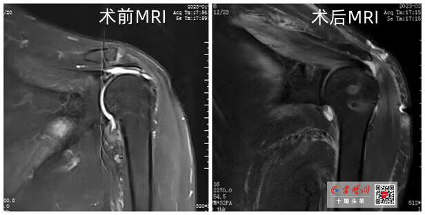 针对周大爷的情况,王全兵团队采取肩袖缝合、肌腱转位等方式,在肩关节镜下,通过微创手段,先对萎缩的肌腱进行松解,让肌腱尽可能复位,然后予以缝合,对不能完全复位的肌腱采用肌腱转位固定。两个小时后,手术完成,周大爷肩关节疼痛立刻得到缓解,在他人的帮助下可以实现手臂自由活动。