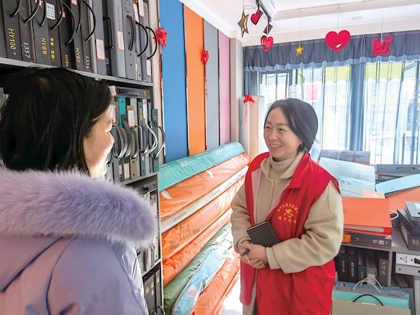 刘鸿青(右)经常上门了解辖区商户经营相关情况。