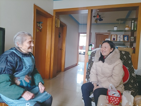 刘娟(右)经常看望慰问辖区老人,了解他们生活上的困难,并提供力所能及的帮助。
