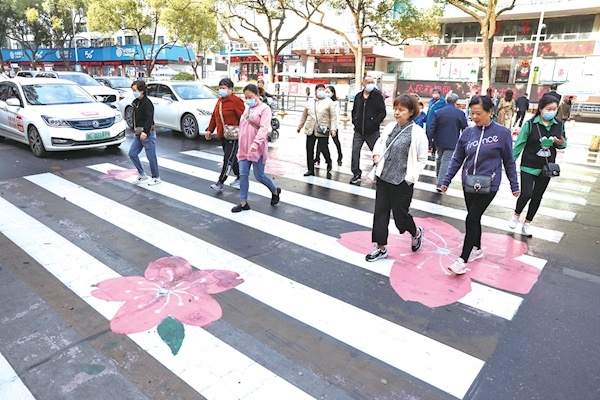 昨日是三八妇女节,市公安交管局将城区彩源广场前的斑马线施划成樱花斑马线,同时在城区6个地方为女性司机免费送粉色头盔200顶,市民纷纷为交管部门的暖心做法点赞。图/记者 张建波