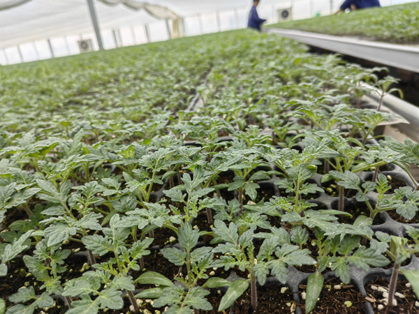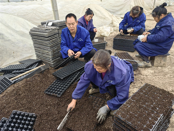 在沙市区岑河镇的荆州市童禾春蔬菜专业合作社温室大棚里,工人们正在扒土、倒种、摆盘,一颗颗种子被种进基质土里。