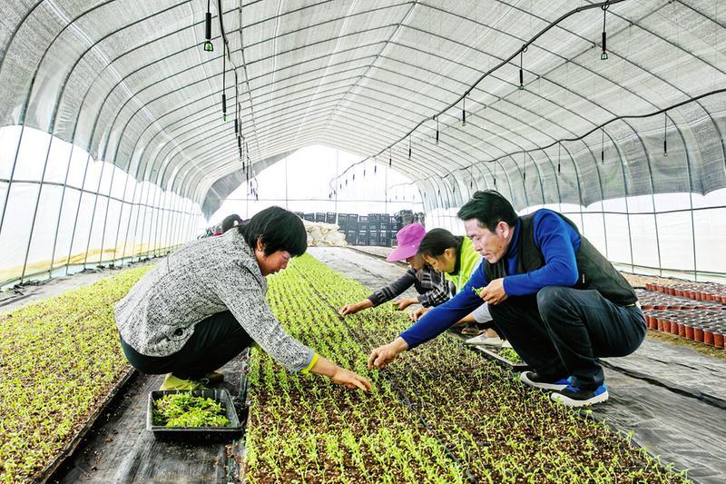 均川镇东润紫海田园工人正在大棚内培育百日菊
