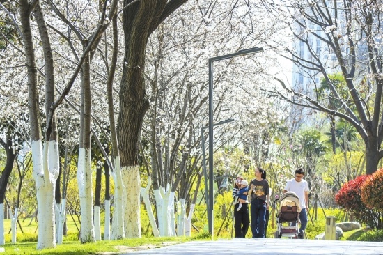 昨日雪如花,今日花如雪。13日,记者来到沙市中山公园南大门,远远看到成片的早樱如云似锦,游客漫步林间,享受春日浪漫。