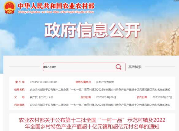 近日,农业农村部发布关于公布第十二批全国“一村一品”示范村镇及2022年全国乡村特色产业产值超十亿元镇和超亿元村名单的通知。