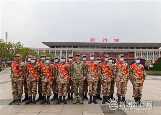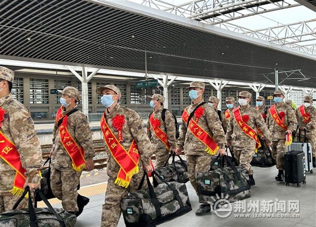 早上7点不到,荆州火车站站前广场上,新兵们胸前佩戴大红花,整齐列队集结,即将踏上奔赴军营的列车。