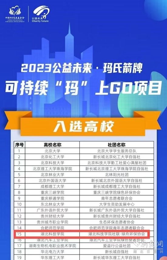 荆楚网(湖北日报网)讯(通讯员 高格 何国松)“包好不乱丢,青年来助力。”3月14日,2023公益未来·玛氏箭牌可持续“玛”上GO全国青年可持续创新项目入选高校名单公示,来自湖北科技学院绿舟环保协会的环保包装创新项目成功入选,这也是该校首次入围此项目。