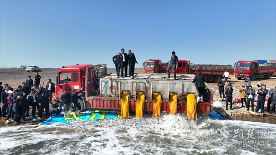 活动现场,一辆辆满载鱼苗的大型货车有序驶向江边,工作人员爬上车,用捞鱼网舀起鱼苗认真察看,随后打开装鱼苗的容器,不同种类的鱼苗沿着放置的斜面倾泻,伴着晶莹的水花,四散游向更远处。