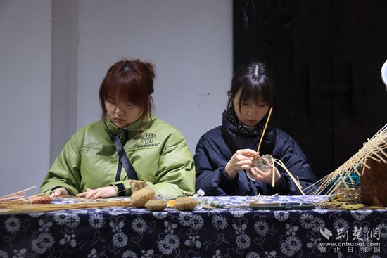 在演出现场旁的乡村记忆馆内,马桥油画风景写生展、鄂南雕花剪纸作品展同时吸引着游人的目光。来自湖北科技学院的学生正在展厅中编织特色竹制品,绘制富有当地民俗特点的文创作品。