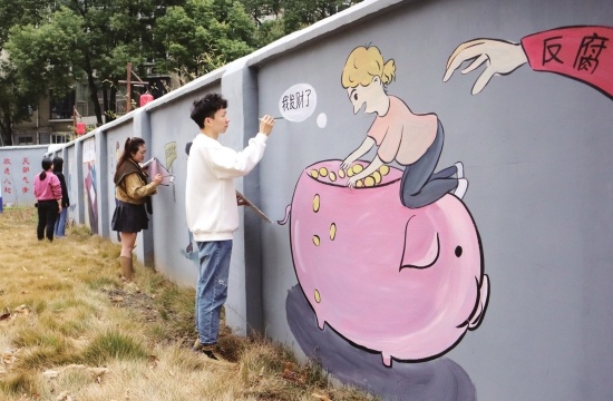 日前,在沙市区胜利街道蛇入山社区生资小区,专业绘画师正在创作廉政漫画。