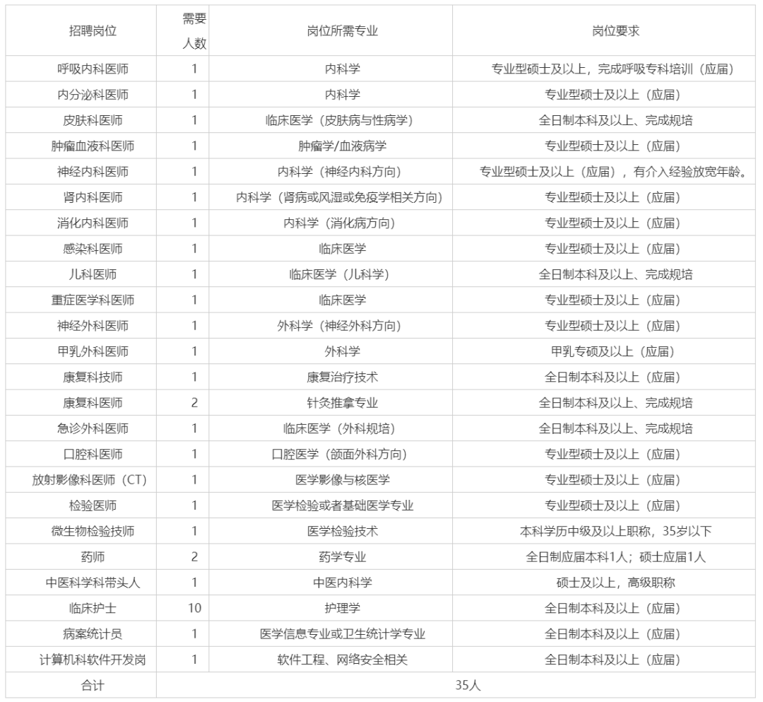 临床专科秘书2人、男内科医生2人、女内科医生1人、妇科医生2人、助理护士 10人、抽血护士3人、临床研究药师2人、临床研究护士3人、体检中心护士4人。