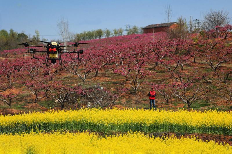 随县洪山镇桥河村农业专业合作社抢抓农时,组织无人机为油菜进行喷药防病,以提高产量。无人机通过GPS定位系统和高精度传感器,精确控制喷洒剂量和范围,安全、省时、省力、高效。 (随州日报全媒记者 李文军摄)