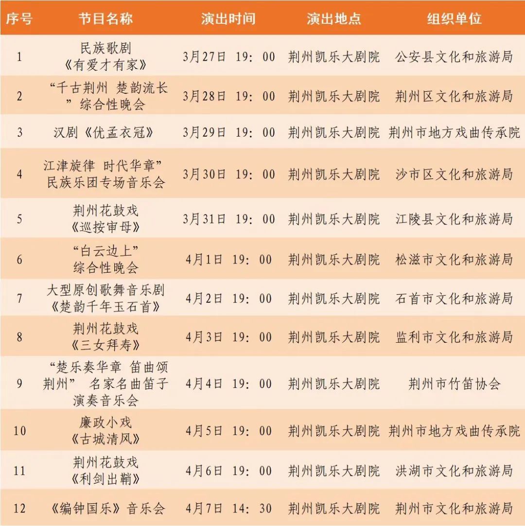 器乐专场2场,为“江津旋律时代华章”沙市区民族乐团专场音乐会和“楚乐奏华章笛曲颂荆州”名家名曲笛子演奏音乐会;