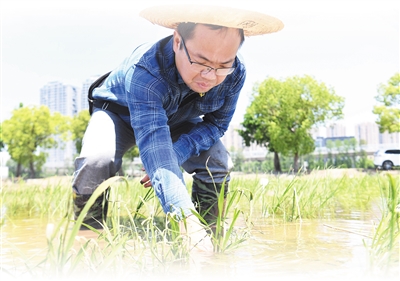 周雷在武昌南湖试验基地进行苗期田间管理。