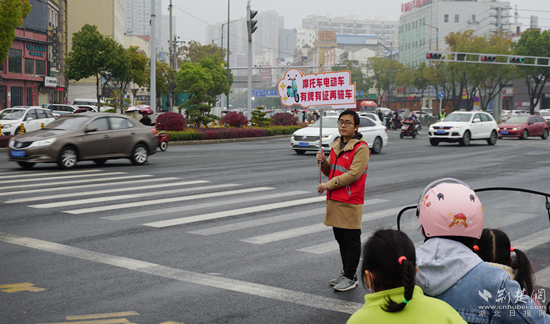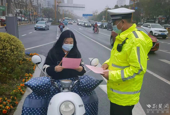 荆楚网(湖北日报网)讯(通讯员肖杰、王睿)“您好,您这样不戴安全头盔骑行电动车非常危险……”3月21日清晨,麻城市公安局交警大队辅警李彬正在雨中值勤,向过往车辆散发文明交通宣传单,并对驾乘电动车不戴安全头盔、逆向行驶、违法载人、随意抄近路等交通违法行为进行劝导,提醒市民时刻谨记交通规则,安全文明出行。