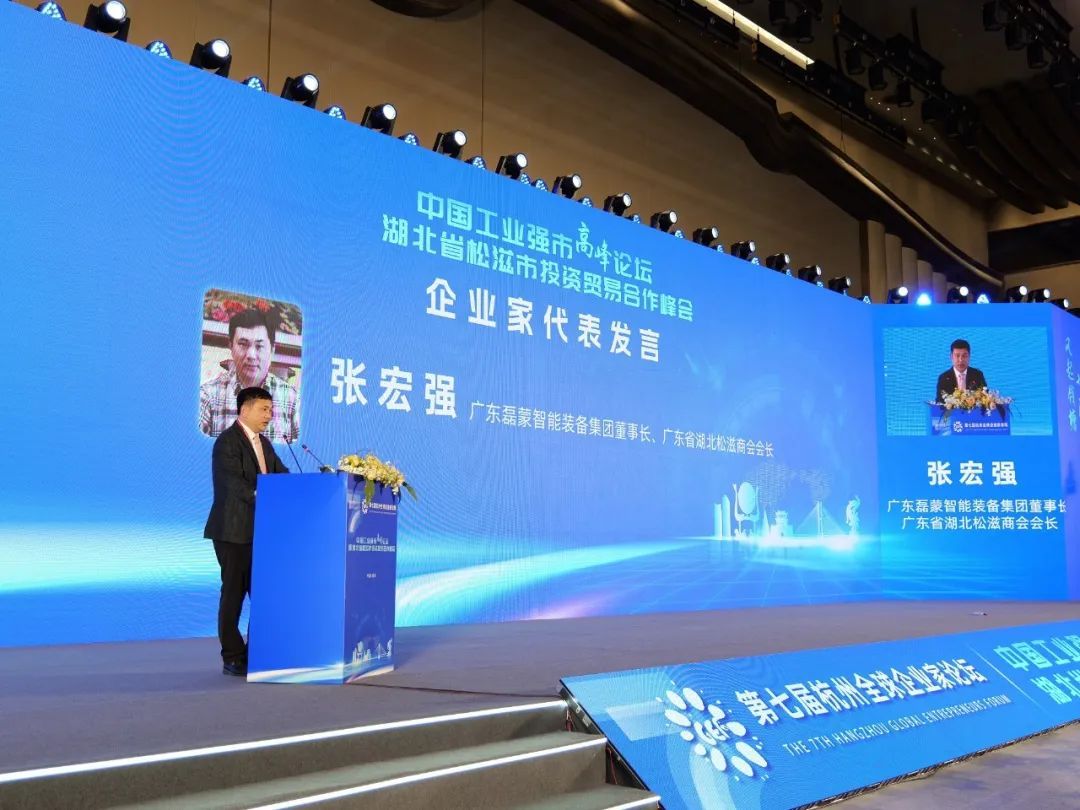 ▲返乡企业家代表广东磊蒙智能装备集团董事长、广东省湖北松滋商会会长张宏强发言