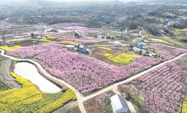 日前,竹山县宝丰镇公平村,大片桃花盛开,吸引众多游客前来观光。近年来,该县围绕生态优先、绿色增收目标,结合美丽乡村建设,大力发展小水果产业,以观光农业助推乡村融合发展。通讯员 邵义龙摄