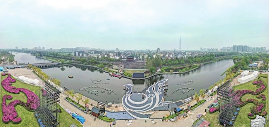 3月28日,航拍位于荆州古城历史文化旅游区东门宾阳楼景区的新建大型水上舞台,已展现出“凤鸟腾云,翱翔九天”的恢弘气势。