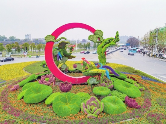 春风送暖,绿植争芳。3月28日,北京西路与东环路交叉口“凤鸣楚天”大型绿雕完成“换装”。