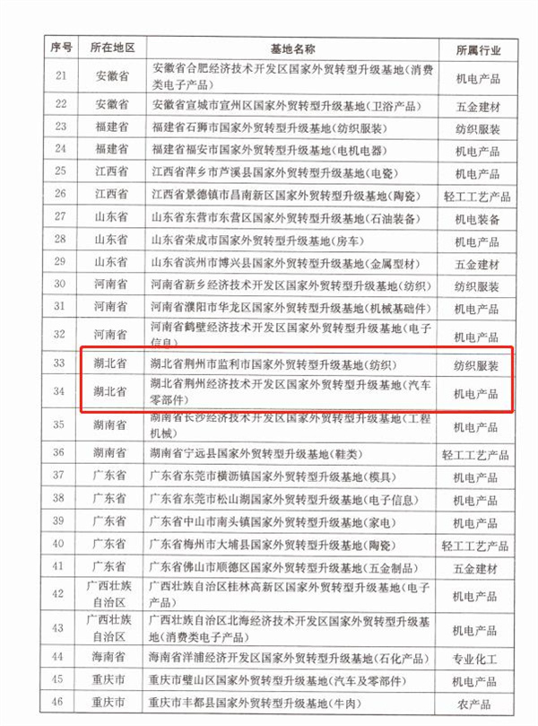 为积极推进国家外贸转型升级基地建设,日前,商务部公布通过2022年国家外贸转型升级基地考核的名单,共66个基地上榜。其中,湖北省荆州市监利市国家外贸转型升级基地(纺织)、湖北省荆州经济技术开发区国家外贸转型升级基地(汽车零部件)名列榜单,荆州为此次湖北唯一上榜城市。