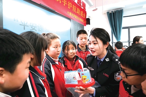 近日,市公安局茅箭区分局在天津路第二小学开展“平安课堂”主题宣讲活动。活动现场,禁毒社工通过 PPT讲课,互动答题送礼品、毒品仿真模型展示等形式,为师生们送上一堂生动的禁毒知识宣传讲座。民警还为师生们上了交通安全课,重点讲解了日常出行中需要注意的交通安全事项。此外,结合辖区实际及电诈案件特点,介绍了常见电信诈骗的类型及作案手法,筑牢反诈“防火墙”。图/记者杨建波特约记者戢子轩