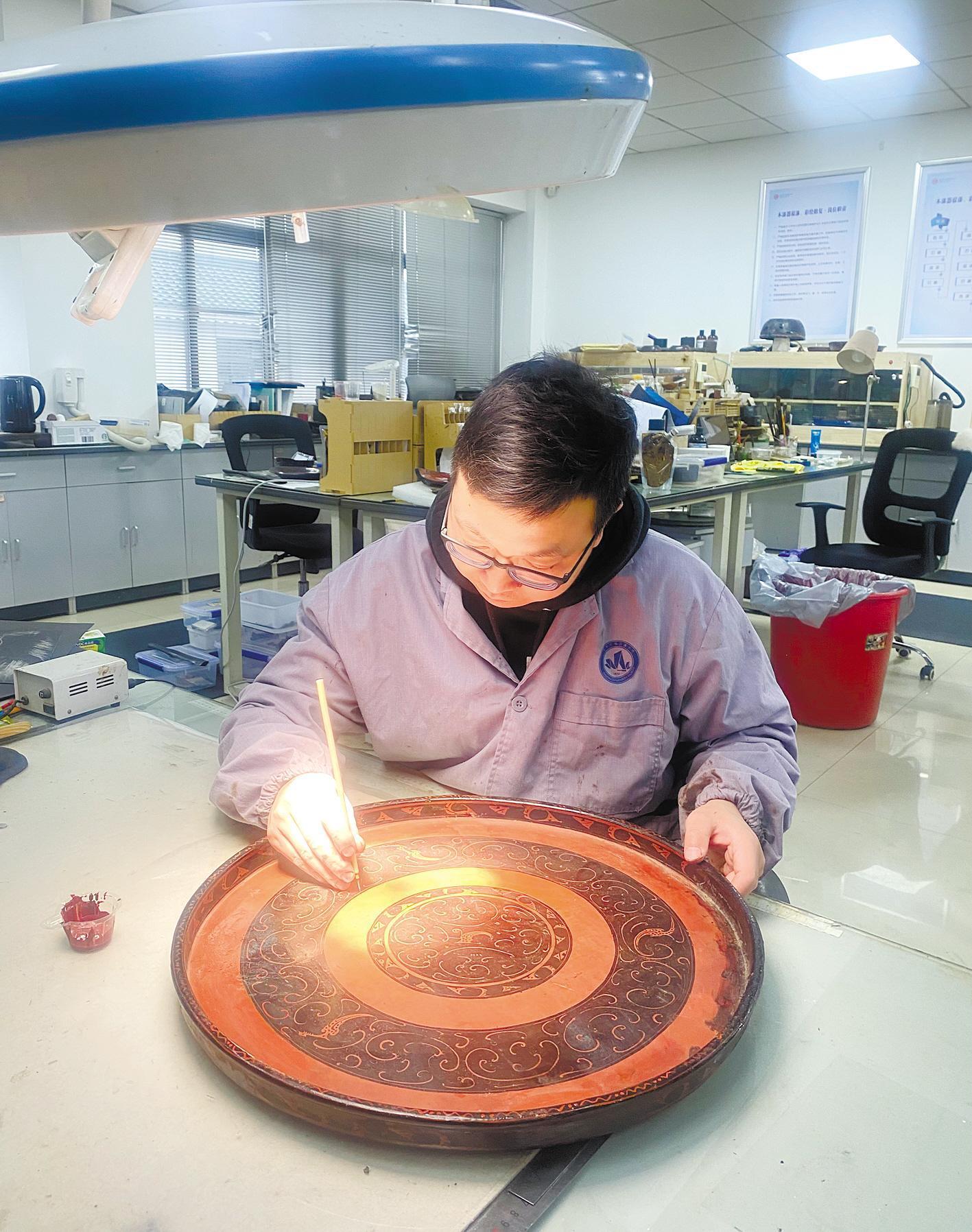 修复师杜可竹对漆盘进行髹漆彩绘。