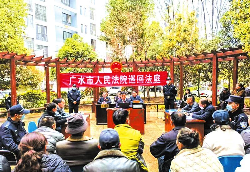 近日,广水市人民法院广水法庭将巡回法庭搬进弘翔名居小区,公开开庭合并审理了4起物业服务合同纠纷案。广水法庭关注群众司法需求,让群众在家门口“零距离”受到法治教育,达到“审理一案、教育一片”的良好效果。 (随州日报特约记者 余尚军 通讯员 李凤莲摄)