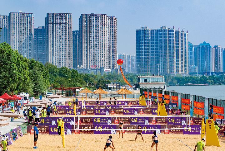 大冶市阳光沙滩上,正在举行沙滩排球比赛。(石勇 摄)