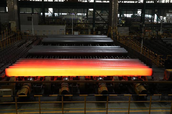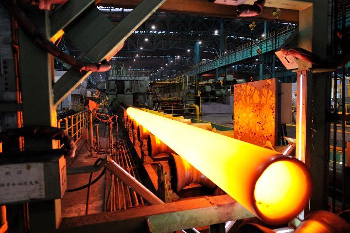 大冶特钢460钢管厂内,一根钢管正在生产线上。新华社记者 潘志伟 摄
