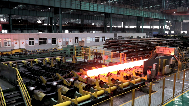 大冶特钢460钢管厂内,一根钢管正在下线。(周巍 摄)