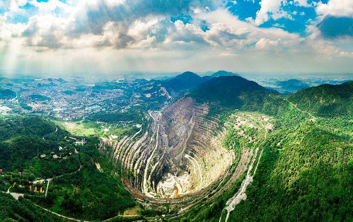 这是大冶铁矿东露天采场旧址,群山环抱之中,一个巨大的“天坑”豁然眼前。(何戈 摄)