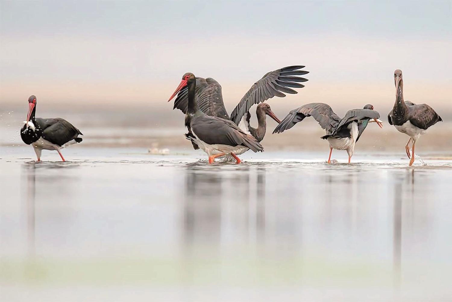 黑鹳在长江石首江段觅食撒欢 摄影:陈建平