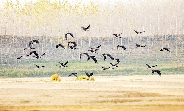 成群黑鹳在长江石首段悠闲飞翔 摄影:余祖云