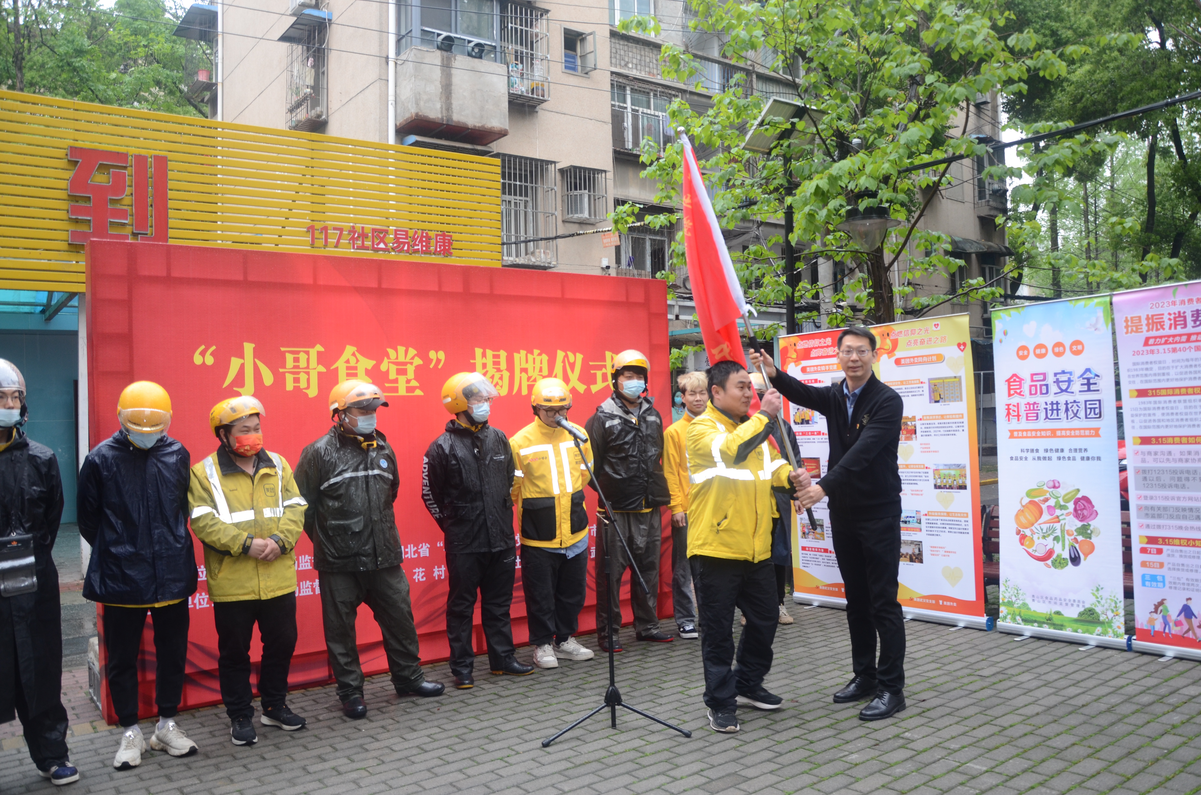 王勤介绍,在省市区组织部门(两新工委)统筹领导下,市场监管部门积极推动“小个专”和外卖送餐领域党建工作,在去年开展“骑心向党、筑梦远航”外卖骑手党建关爱主题活动基础上,指导推动外卖送餐平台党组织和街道社区切合骑手职业特点、发挥社区食堂优势,共建“小哥食堂”。外卖骑手作为本次活动的主要惠及群体,也以实际行动回馈社会,参与社会基层治理。目前,在美团武汉党支部的倡议下,一批热心公益、熟悉社情民意、责任心很强的党员和爱心外卖小哥,成立了钢城志愿服务队,在“小哥食堂”揭牌的同时,举行了授旗仪式。他们将在做好本职工作的同时积极参与社会治理,投身志愿服务,争当餐饮安全社会监督员、社情民意信息员、精神文明宣传员、城市生活服务员,努力塑造湖北骑手的良好形象,共同缔造美好生活。作为食品安全监管者、守护者,市场监管部门将进一步加强对“小哥食堂”餐饮安全监管,希望“小哥食堂”不断丰富菜品样式,改进餐饮服务,让小哥们安全放心就餐,真正把“小哥食堂”打造成为小哥们在外奔波时的“温暖港湾”“爱心驿站”。