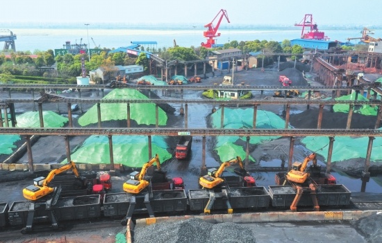 日前,荆州市地方铁路有限公司铁水联运旺港码头,机声轰鸣,4台抓机及10余辆翻斗车正从火车厢里卸煤、转运。