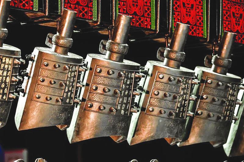 编钟最高一层镌刻着钟名“天子长安”的铭文,钟体、钟架铭文由《诗经》周颂、大雅和乐律构成,编钟的龙纹、鱼纹、绳纹等纹饰主要取自陕西地域周朝时期出土文物,钟架立柱造型为上古时期神兽之王“犼”,与华表神兽造型一致,凸显礼乐重器的威严与力量,每个细节都蕴含着文化力量。“天子长安”编钟是一套音色统一、声音纯正、音准偏差极小的高质量水平的编钟。