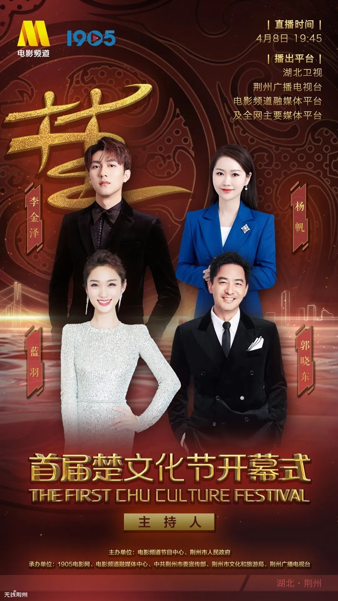最强阵容,正式官宣!4月8日至9日,首届楚文化节开幕式与2022-2023年度电影频道M榜暨中国电影大数据盛典将在湖北省荆州市接连举办。近百位电影人、音乐人将盛装亮相,在历史悠久的荆州古城感受楚文化魅力,于今年首场中国电影盛宴共赏大数据力量,与全网观众一同见证M榜各项荣誉的诞生。