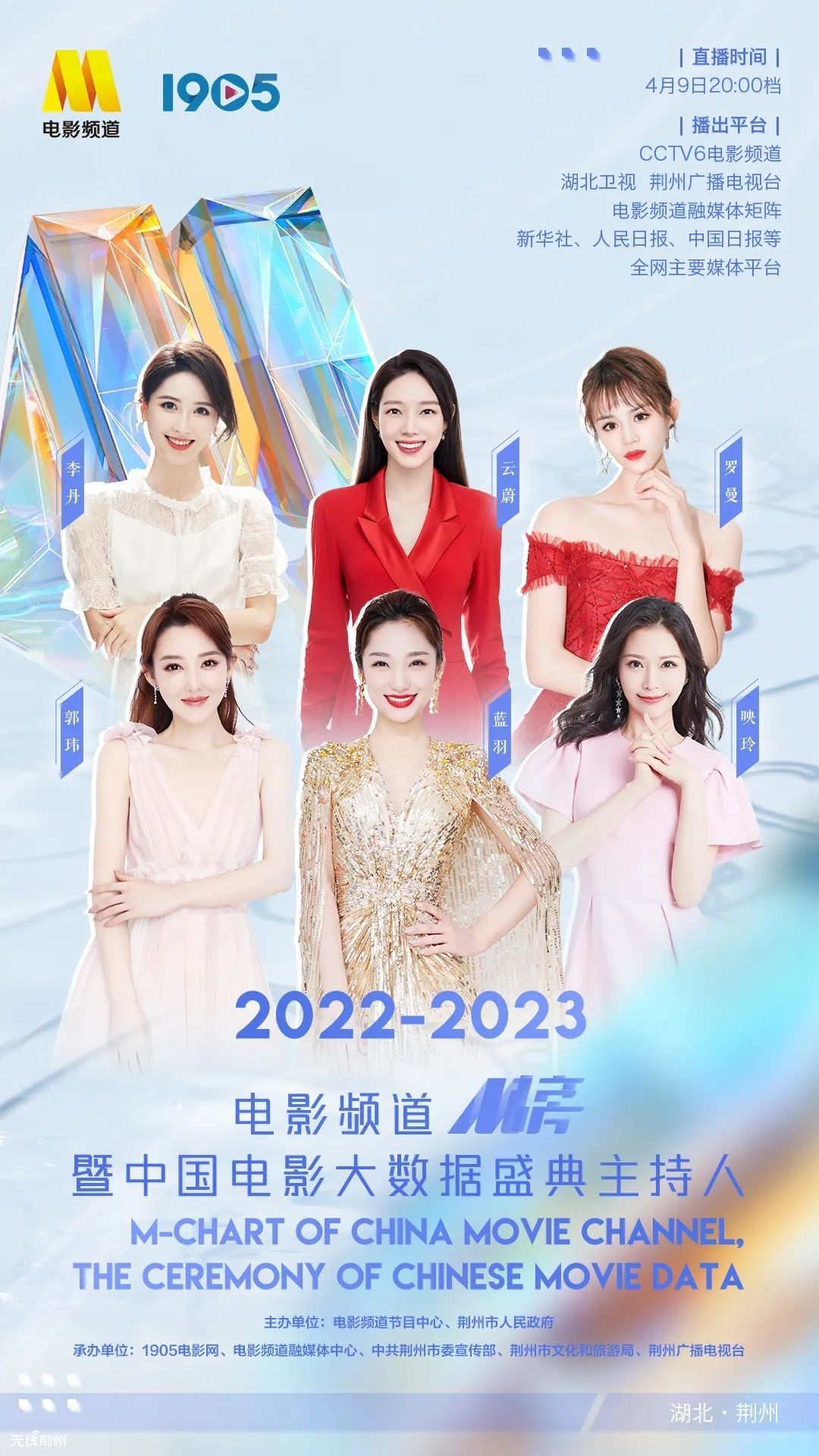 主持阵容,魅力登场。电影频道“六公主”主持团——蓝羽、郭玮、映玲、云蔚、李丹、罗曼将携手主持2022-2023年度电影频道M榜暨中国电影大数据盛典,承载大众对电影频道的信赖,热情迎接八方宾客。电影频道主持人蓝羽、金泽还将与“湖北女婿”电影人郭晓东及荆州广播电视台主持人杨帆共同主持首届楚文化节开幕式,共话荆楚文化魅力。