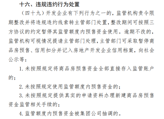在违规违约行为处置方面,开发企业有下列行为之一的,监管机构责令限期整改并将违规违约线索转主管部门处置,整改期间可按照三方协议的约定暂停其监管额度内预售资金使用。逾期不改的,监管机构可视情况提请主管部门处理,主管部门可采取暂停商品房预售、信用扣分并记入房地产开发企业信用档案,向社会公示等:
