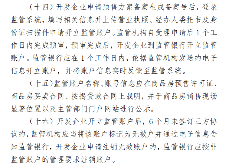 监管账户名称、账号信息应在商品房预售许可证、 商品房买卖合同、按揭贷款合同上载明,并于商品房销售现场显著位置以及主管部门门户网站进行公示。开发企业开立监管账户后,6 个月未签订三方协议的,监管机构应当将该账户标记为无效户并通过电子信息告知监管银行,开发企业申请注销无效账户的,监管银行应按非监管账户的管理要求注销账户。