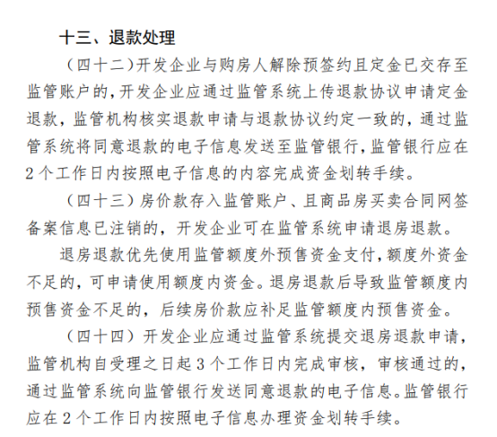 开发企业应通过监管系统提交退房退款申请,监管机构自受理之日起3个工作日内完成审核,审核通过的,通过监管系统向监管银行发送同意退款的电子信息。监管银行应在2个工作日内按照电子信息办理资金划转手续。