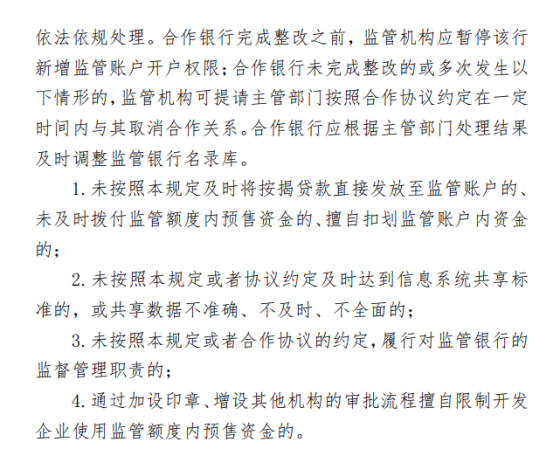 1.未按照本规定及时将按揭贷款直接发放至监管账户的、 未及时拨付监管额度内预售资金的、擅自扣划监管账户内资金的;